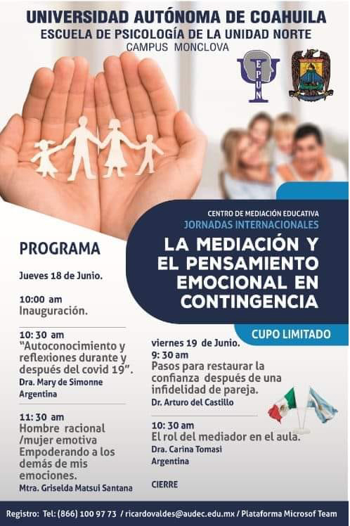 MONCLOVA, Coahuila; 16 de junio de 2020.- La Universidad Autónoma de Coahuila, a través de la Escuela de Psicología Unidad Norte (ESPUN), invita a las Jornadas Internacionales "La mediación y el pensamiento emocional en contingencia", que se llevarán a cabo a través de Microsoft Teams, el jueves 18 y viernes 19 de junio.
