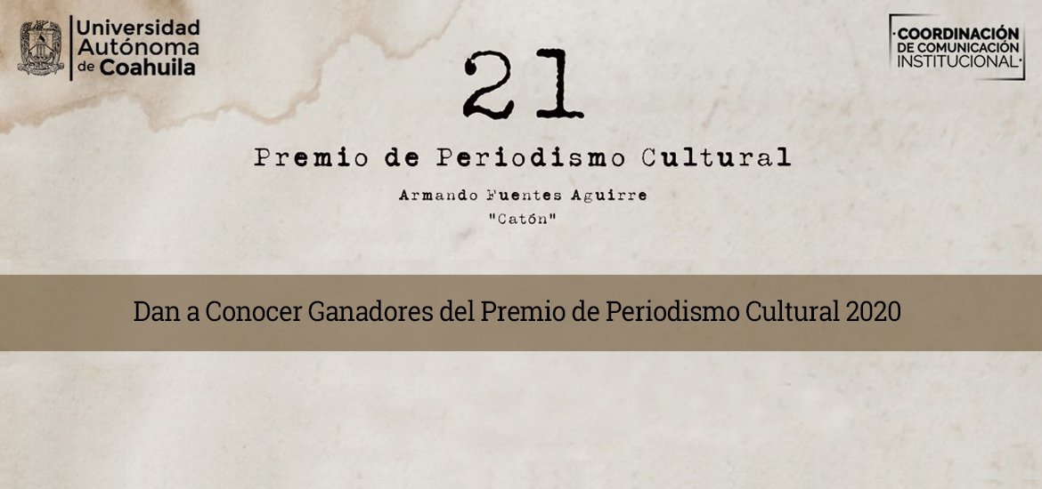 SALTILLO, Coahuila; 17 de junio de 2020.- La Universidad Autónoma de Coahuila, da a conocer a los ganadores de la 21ª Edición del Premio de Periodismo Cultural Armando Fuentes Aguirre "Catón", que reconoce los mejores trabajos que en materia cultural realizan periodistas de prensa, radio y televisión.
