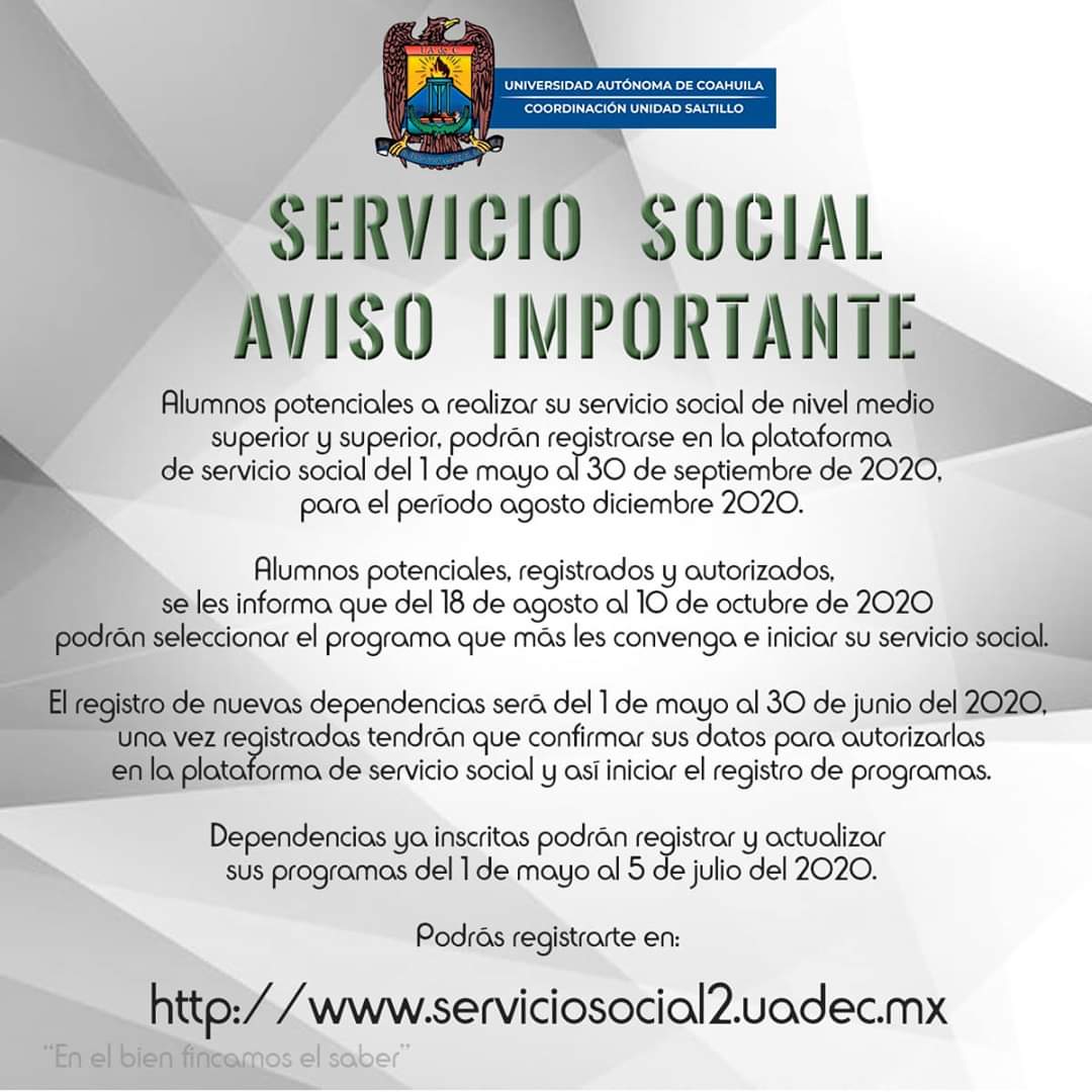 SALTILLO, Coahuila; 23 de junio de 2020.- La Universidad Autónoma de Coahuila, a través del Departamento Central del Servicio Social, informa que las fechas de registro para realizar el servicio social del periodo agosto-diciembre de 2020 ya están abiertas y disponibles para los alumnos.