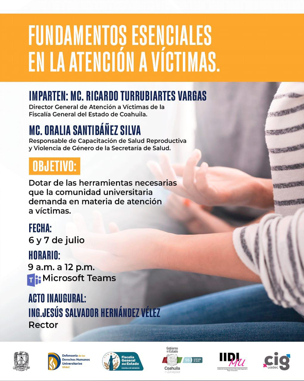 Señaló que, aunque el evento esta dirigido al personal de la UAdeC, también se extiende la invitación a miembros de otras universidades que sean los primeros respondientes en casos de atención a víctimas, los participantes recibirán una constancia.