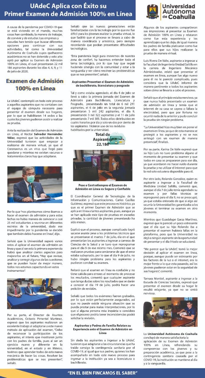 Histórico, por primera vez se aplica examen de admisión en línea. La UAdeC es la primera Universidad Pública Autónoma en enfrentar este reto.