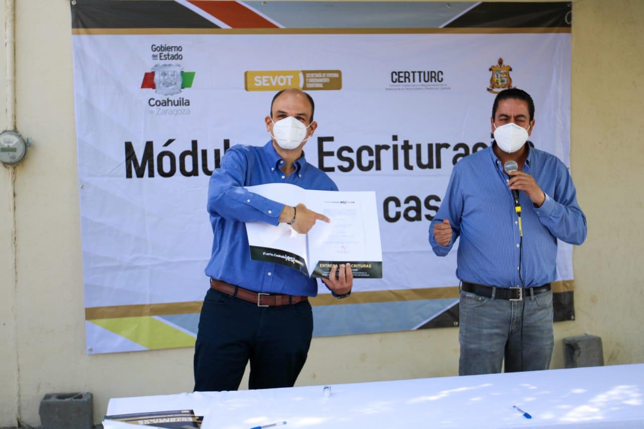 Ramos Arizpe, Coahuila de Zaragoza; a 15 de Julio de 2020.- Con el interés de beneficiar a un mayor número de familias coahuilenses con la legal tenencia de su tierra, el Gobierno del Estado, a través de la Secretaría de Vivienda y Ordenamiento Territorial (SEVOT), promueve en los 38 municipios de la entidad el programa de escrituración.