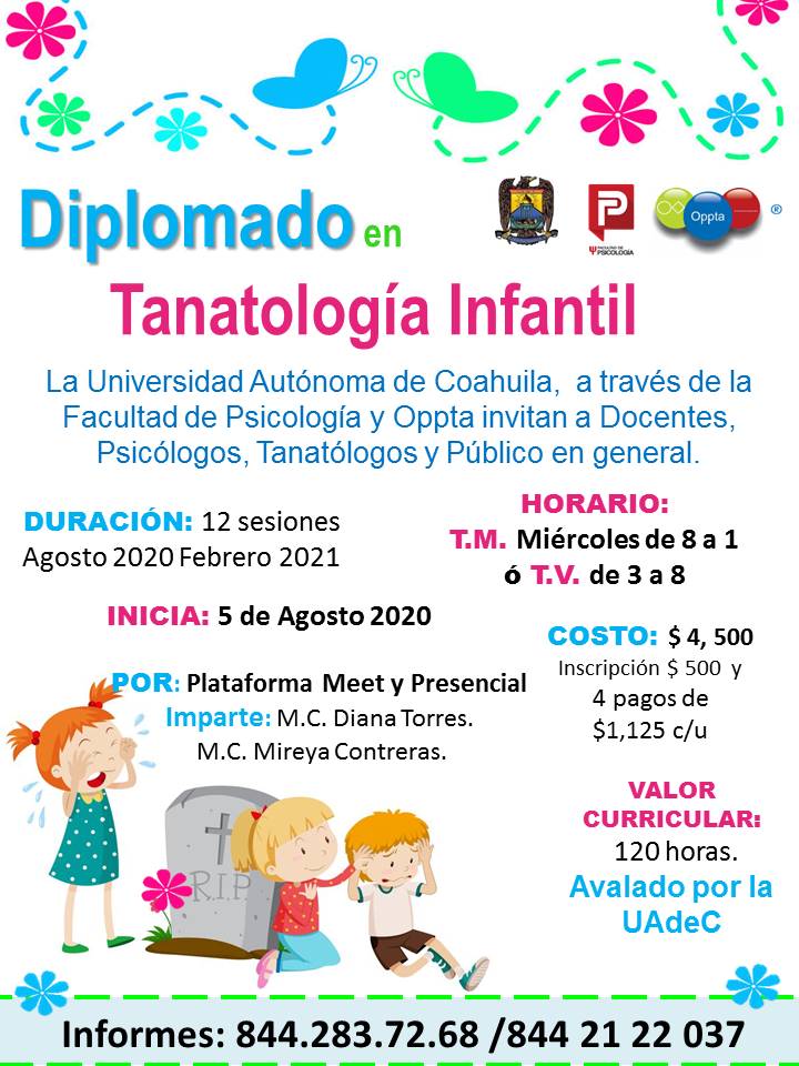 SALTILLO, Coahuila; 24 de julio de 2020.- La Universidad Autónoma de Coahuila a través de la Facultad de Psicología, en coordinación con el Centro de Orientación Psicológica, Pedagógica y Tanatológica (OPPTA), invitan a cursar el diplomado en Tanatología Infantil que inicia el 5 de agosto.