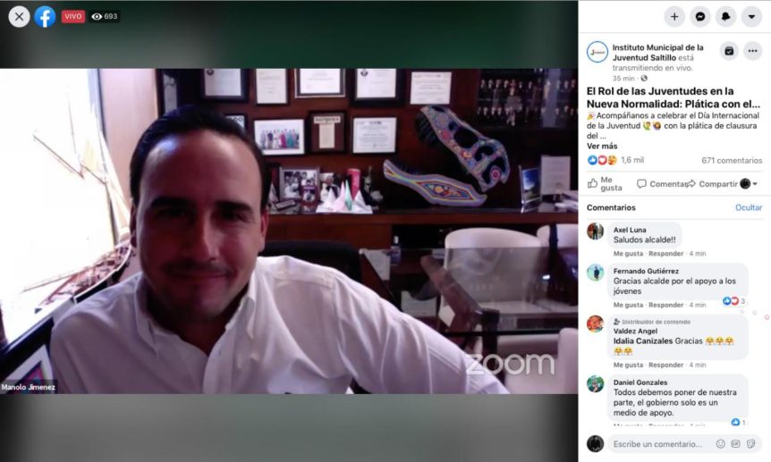 En el marco de la conmemoración del Día Internacional de la Juventud, el alcalde Manolo Jiménez Salinas interactuó de manera virtual con jóvenes saltillenses, en donde hizo un reconocimiento a las juventudes de la ciudad, e hizo un importante llamado a la corresponsabilidad que tienen durante esta contingencia.