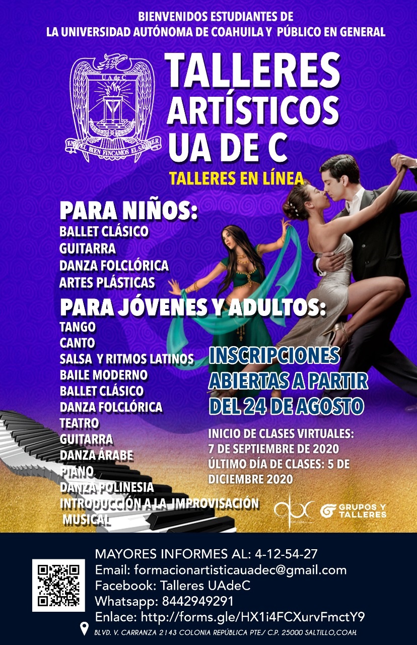 SALTILLO, Coahuila; 20 de agosto de 2020.- Para apoyar la formación integral de sus estudiantes y promover la cultura entre la comunidad en general, la Universidad Autónoma de Coahuila invita a inscribirse a partir del lunes 24 de agosto a los talleres de formación artística en modalidad virtual para el periodo septiembre-diciembre 2020.