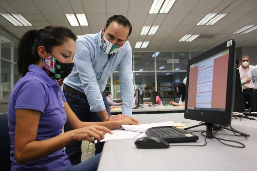 En el recorrido por el call center, también estuvieron Marco Antonio Flores Verduzco, coordinador del centro; Óscar Pimentel González, director del Implan Saltillo; y Alejandro Luna, director de Servicios Administrativos del municipio.