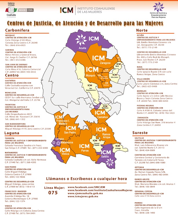 Saltillo, Coahuila de Zaragoza; a 24 Agosto de 2020.- El Gobierno del Estado, a través de la Secretaría de Gobierno y del Instituto Coahuilense de las Mujeres (ICM), cuenta con diversos centros especializados para brindar servicios multidisciplinarios para las mujeres en situación de violencia en todo Coahuila.Katy Salinas Pérez, titular del ICM, afirmó que los Centros tienen como objetivo ofrecer servicios integrales, programas y acciones dirigidos a las mujeres víctimas de violencia, a fin promover la igualdad de oportunidades y de trato entre hombres y mujeres, la no discriminación, la no violencia, el ejercicio de todos los derechos humanos de las mujeres y niñas, así como su incorporación en todos los ámbitos de nuestra sociedad coahuilense.