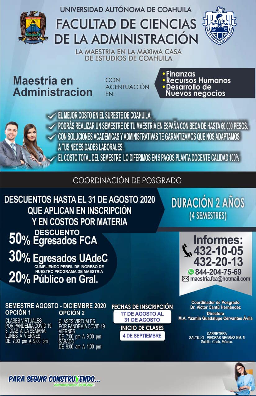 SALTILLO, Coahuila; 28 de agosto de 2020.- La Universidad Autónoma de Coahuila, a través de la Facultad de Ciencias de la Administración FCA Unidad Saltillo, convoca a inscribirse a la Maestría en Administración con acentuación en Finanzas, Recursos Humanos y Desarrollo de Negocios.