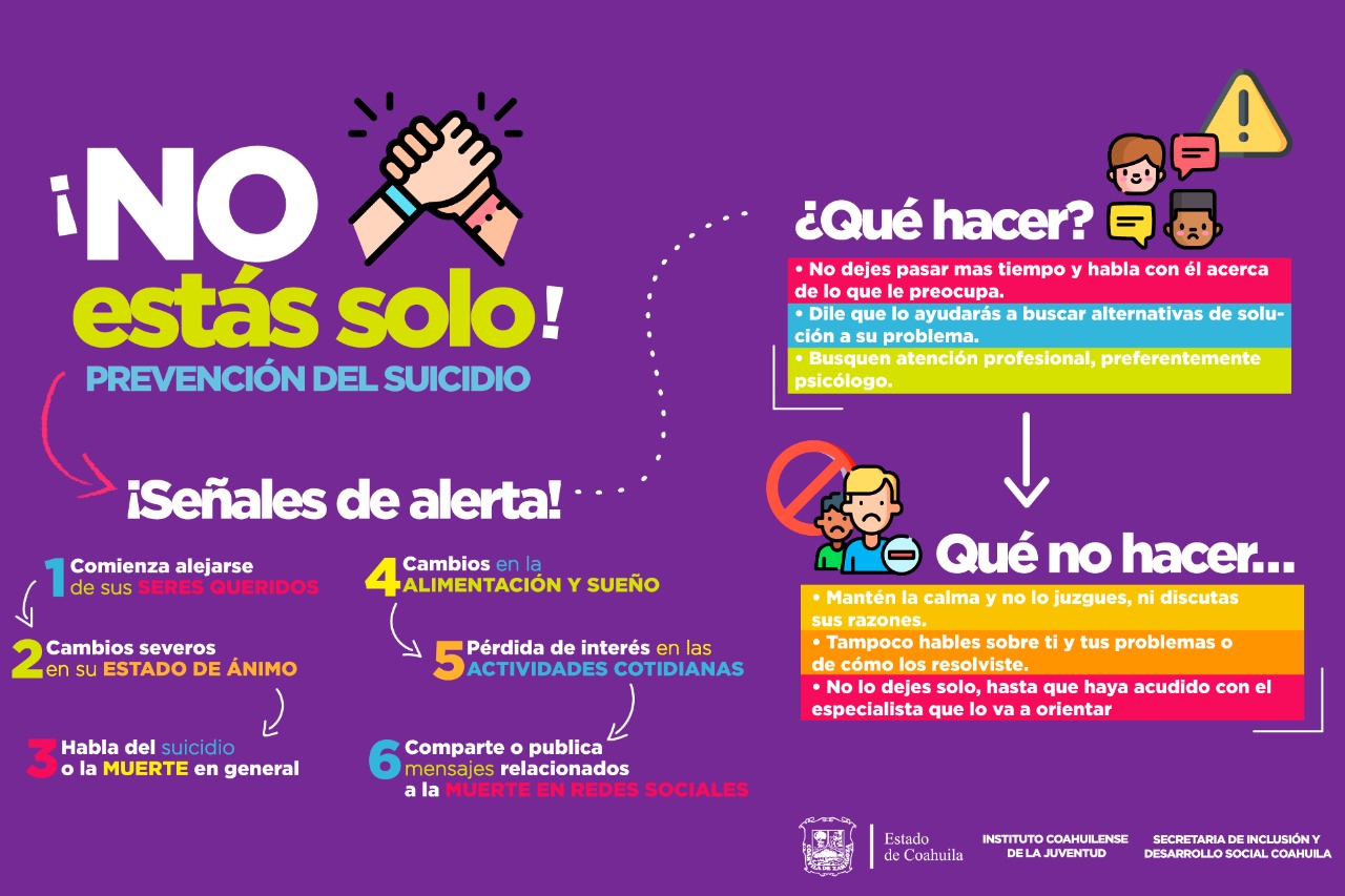 Además, entre las actividades que lleva a cabo el instituto está la publicación de material gráfico para concientizar sobre las señales de alerta que pueden presentarse en una persona con tendencias suicidas, especialmente en jóvenes, como lo son los cambios del comportamiento, expresión de pensamientos negativos y con tendencias a la muerte, despedirse, regalar las pertenencias y tener comportamientos autodestructivos.