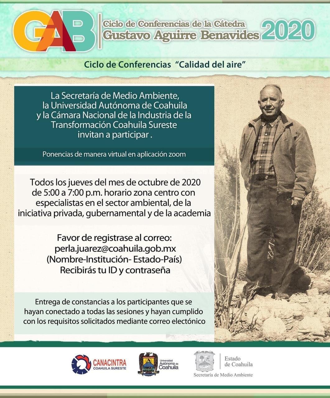 SALTILLO, Coahuila; 17 de septiembre de 2020.- La Coordinación de Agenda Ambiental Universitaria de la Universidad Autónoma de Coahuila, la Secretaría del Medio Ambiente y la Cámara Nacional de la Industria de la Transformación (CANACINTRA) Región Sureste, invitan a participar de manera virtual en el Ciclo de Conferencias "Calidad del Aire" de la Cátedra Gustavo Aguirre Benavides 2020.