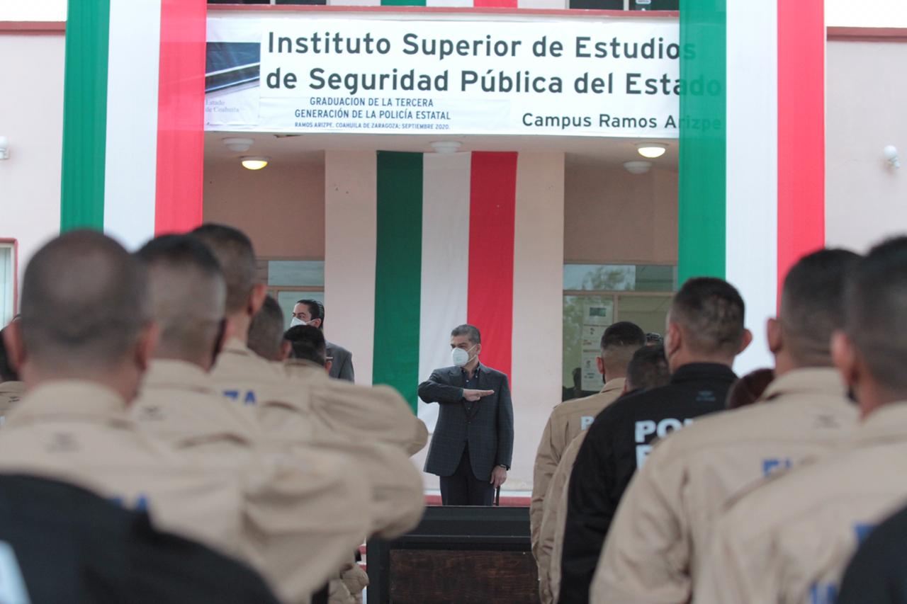 Asimismo, resaltó que pese a la contingencia sanitaria por el Covid-19 en Coahuila se mantuvo activo el adiestramiento y la profesionalización de los nuevos elementos, que se integrarán a la lucha permanente de su Administración en contra de la delincuencia.