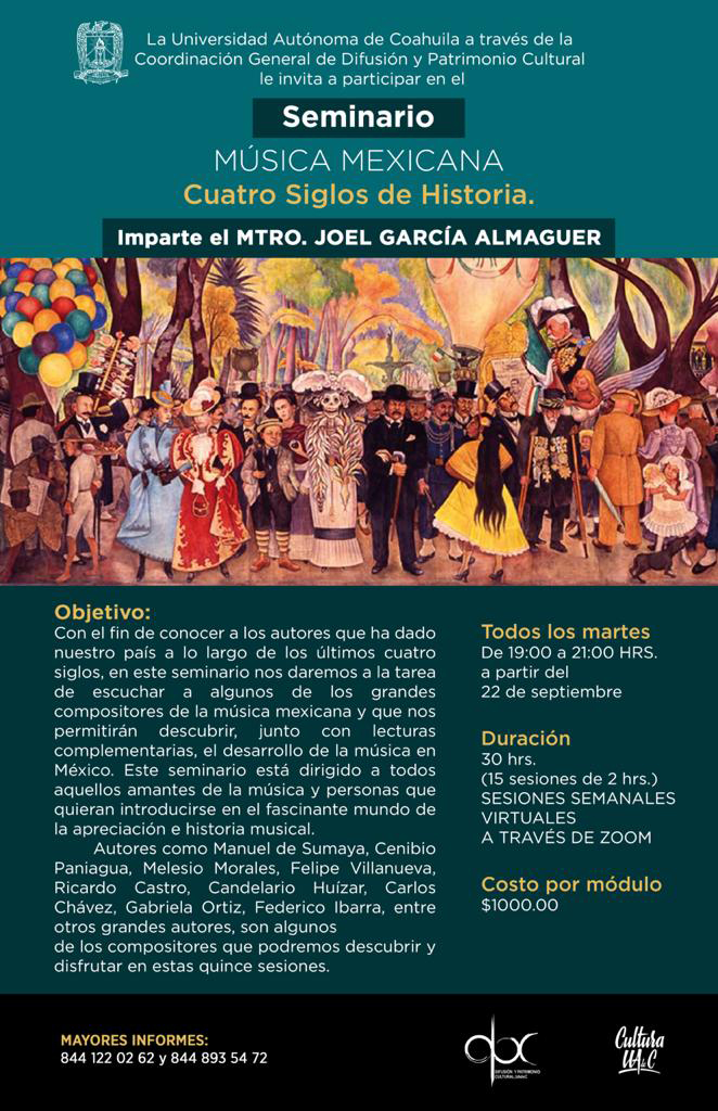 SALTILLO, Coahuila; 18 de septiembre de 2020.- La Coordinación General de Difusión y Patrimonio Cultural de la Universidad Autónoma de Coahuila convoca a los amantes de la música y al público en general a participar en el Seminario "Música Mexicana, Cuatro Siglos de Historia" que iniciará el martes 22 de septiembre de 2020 a través de la plataforma Zoom.