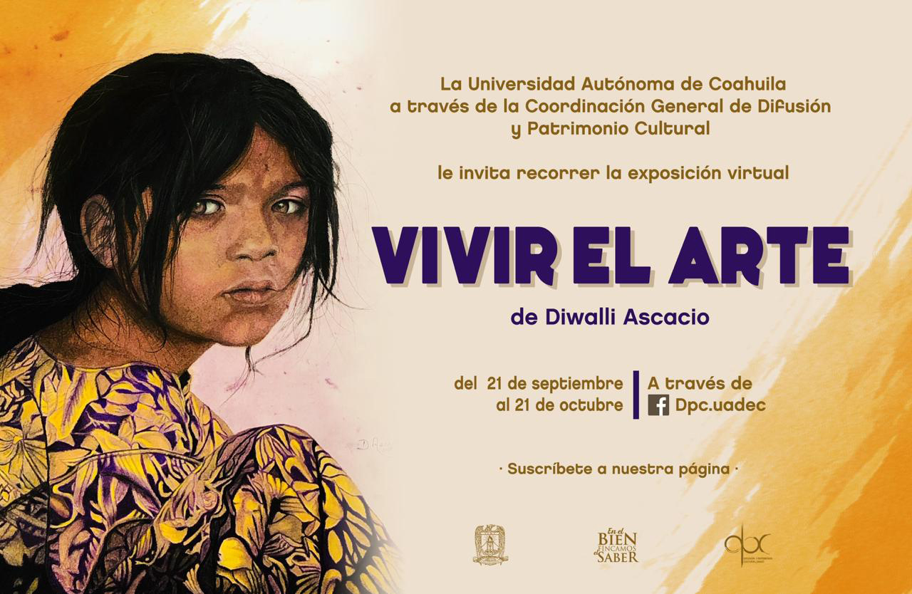 En esta ocasión la máxima casa de estudios ofrece de manera virtual la exposición "VIVIR EL ARTE", exposición que refleja la retrospectiva de la artista, y podrá disfrutarse en la página de Facebook @dpc.uadec o siguiendo el enlace: https://artspaces.kunstmatrix.com/en/exhibition/2454043/vivir-el-arte-de-diwalli-ascacio.