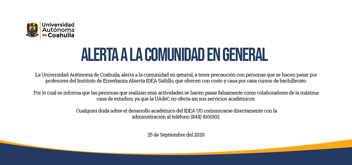 SALTILLO, Coahuila; 25 de septiembre de 2020.- La Universidad Autónoma de Coahuila, exhorta a la comunidad universitaria y población en general, a estar alertas y no caer el fraude de personas que se hacen pasar por profesores del Instituto de Enseñanza Abierta IDEA Unidad Saltillo, que ofrecen casa por casa cursos de bachillerato.