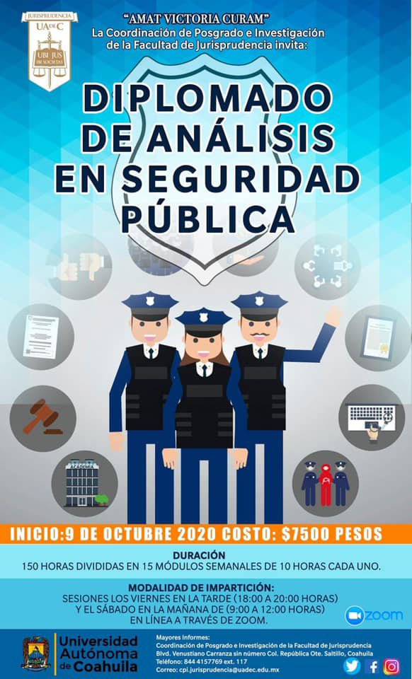 SALTILLO, Coahuila; 28 de septiembre de 2020.- La Coordinación de Posgrado e Investigación de la Facultad de Jurisprudencia de la Universidad Autónoma de Coahuila, invita a cursar el Diplomado de Análisis en Seguridad Pública que iniciará el 9 de octubre de 2020.
