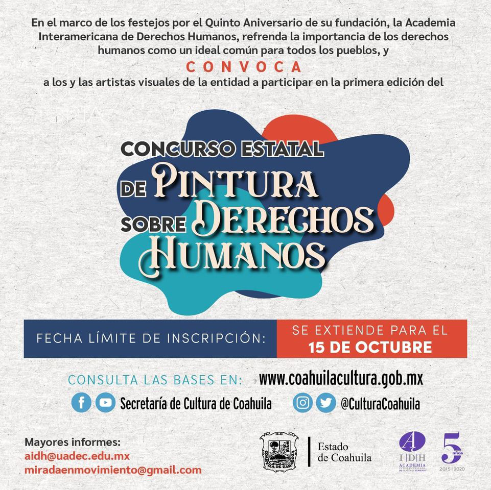 SALTILLO, Coahuila; 2 de octubre de 2020.- La Academia Interamericana de Derechos Humanos AIDH de la Universidad Autónoma de Coahuila en conjunto con la Secretaria de Cultura del Gobierno del Estado, amplían el plazo para la recepción de trabajos de la primera edición del Concurso Estatal de Pintura sobre Derechos Humanos, los interesados a participar tienen como fecha límite el 15 de octubre de 2020.