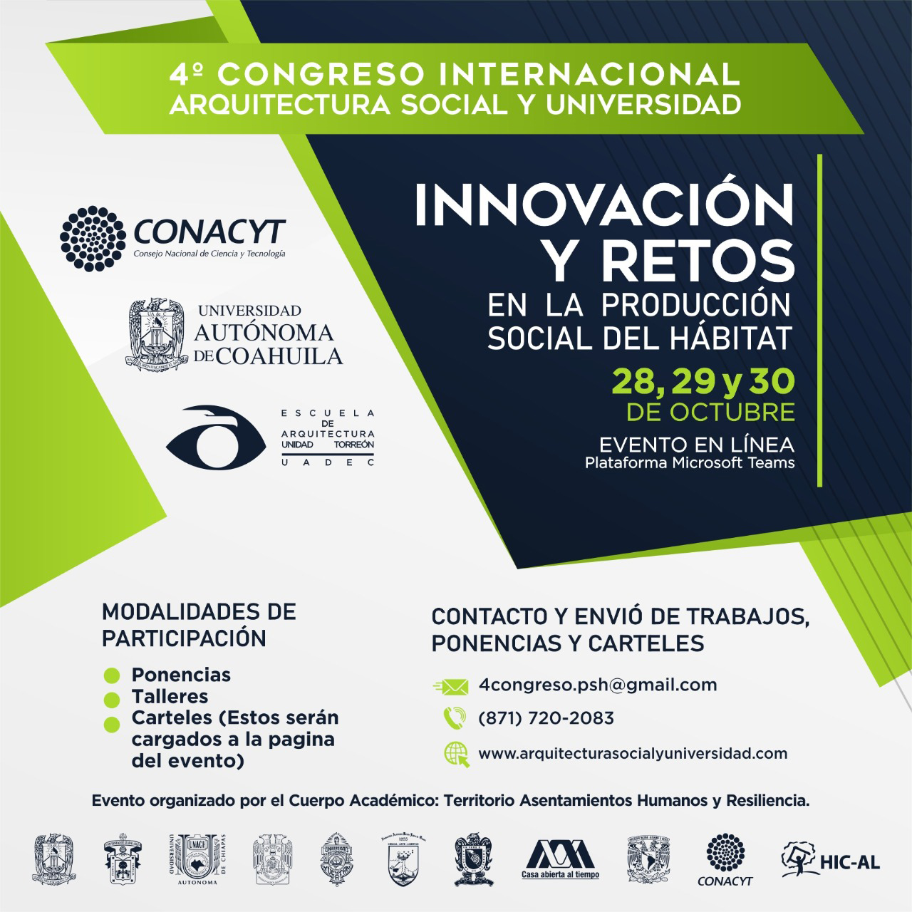 TORREÓN, Coahuila; 9 de octubre de 2020.- Con el fin de ofrecer a los universitarios espacios que les permitan adquirir nuevos conocimientos fuera de las aulas, la Escuela de Arquitectura Unidad Torreón de la Universidad Autónoma de Coahuila, invita al "4º Congreso Internacional, Arquitectura Social y Universidad: Innovación y Retos en la producción social del hábitat".