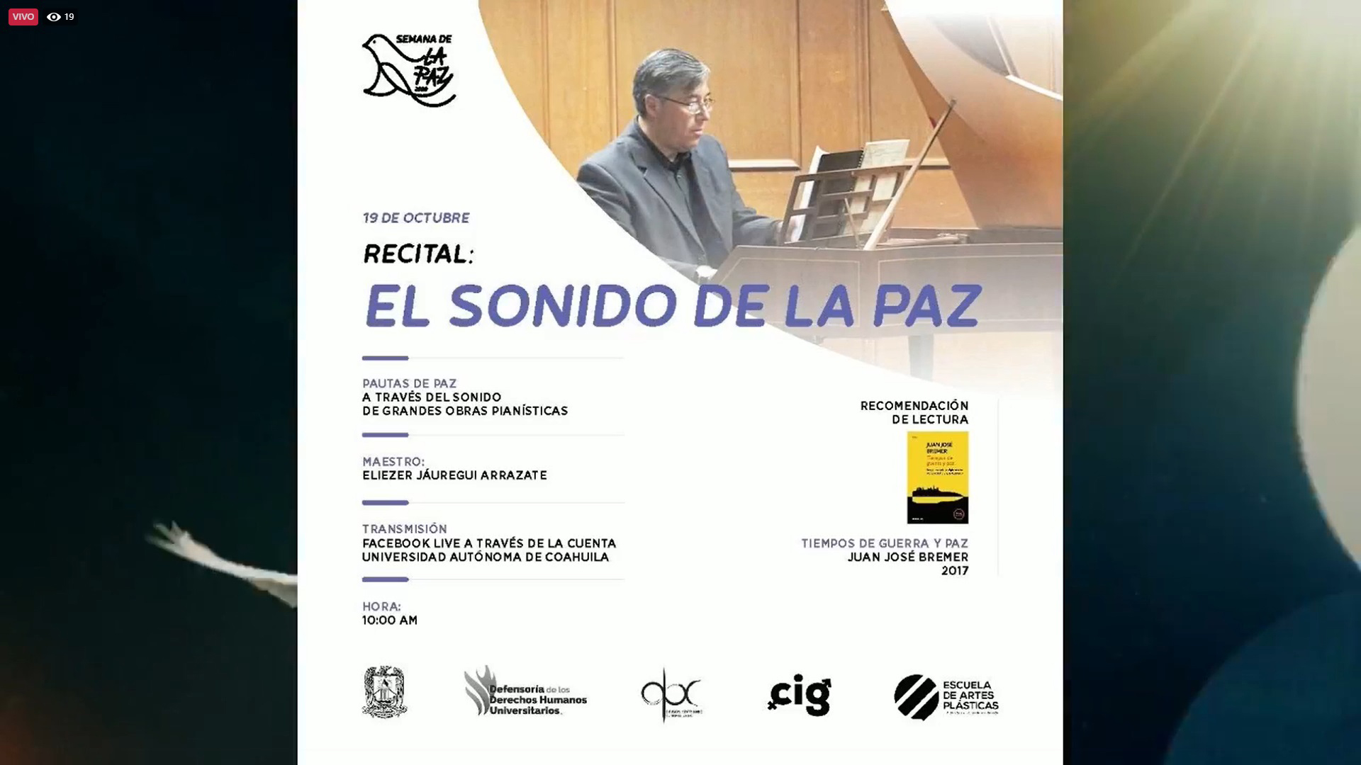Como parte de las actividades de la Semana de la Paz, se llevó a cabo el recital "Pautas de Paz", a través de grandes obras pianísticas por el Maestro Eliezer Jáuregui Arrazate, titular de la Coordinación de Difusión y Patrimonio Cultural, quien compartió la historia de cada una de las piezas y el impacto que tuvieron dentro del mundo musical.