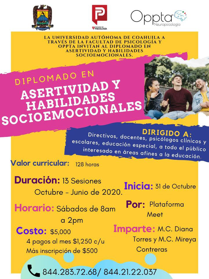SALTILLO, Coahuila; 27 de octubre de 2020.- La Facultad de Psicología de la Universidad Autónoma de Coahuila en conjunto con el centro de orientación, psicológica, pedagógica y tanatológica "Oppta Neuropsicología" invitan a cursar el Diplomado en Asertividad y Habilidades Socioemocionales.