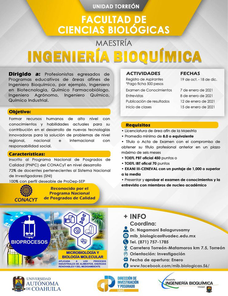 TORREÓN, Coahuila; 5 de noviembre de 2020.- La Facultad de Ciencias Biológicas Unidad Torreón de la Universidad Autónoma de Coahuila convoca a egresados de licenciaturas en áreas del conocimiento afines a las ciencias químico-biológicas a cursar la Maestría en Ingeniería Bioquímica que se apertura en enero de 2021.