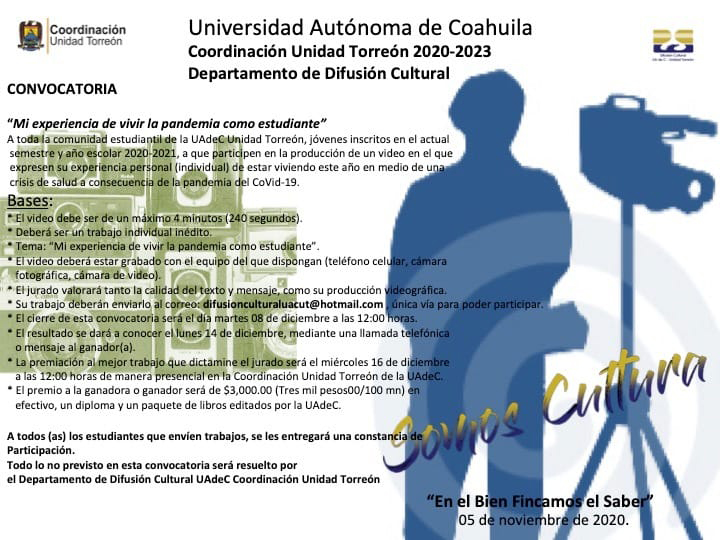 TORREÓN, Coahuila; 13 de noviembre de 2020.- La Coordinación de Unidad Torreón a través del Departamento de Difusión Cultural de la Universidad Autónoma de Coahuila, convoca a su comunidad estudiantil a participar en la producción de un video en el que cuenten su experiencia al estar viviendo este año en medio de una crisis de salud a consecuencia de la pandemia por COVID-19.