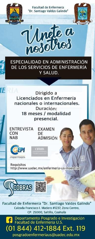 SALTILLO, Coahuila; 13 de enero de 2021.- La Facultad de Enfermería "Dr. Santiago Valdés Galindo" de la Universidad Autónoma de Coahuila, convoca a los profesionales de la enfermería a participar en el programa de Especialidad de Administración en Servicios de Enfermería y Salud, cuyas clases iniciarán el 22 de enero de 2021.