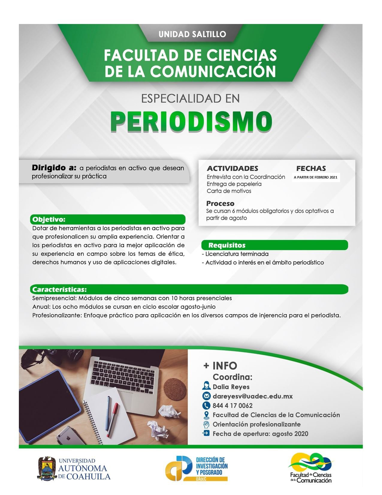 SALTILLO, Coahuila, 28 de enero de 2021.- La Facultad de Ciencias de la Comunicación de la Universidad Autónoma de Coahuila convoca a periodistas en activo a inscribirse a la Especialidad en Periodismo para el ciclo escolar agosto-diciembre de 2021.