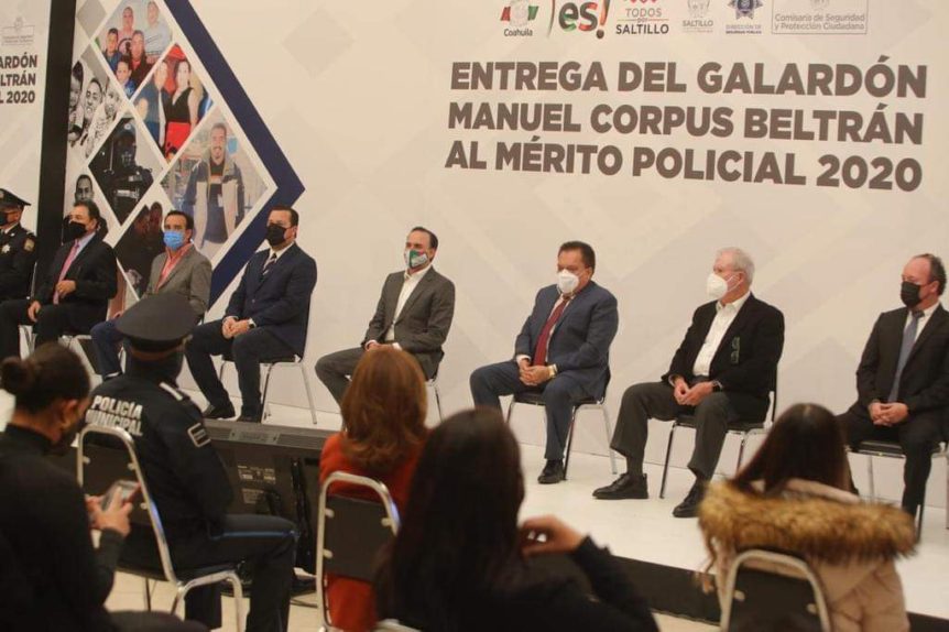 El alcalde de Saltillo, Manolo Jiménez Salinas entregó el Galardón Manuel Corpus Beltrán al Mérito Policial 2020 y destacó que, si Saltillo se consolidó entre las ciudades más seguras de México, es debido al trabajo que se realiza en la policía municipal y a la coordinación que existe con las diferentes instancias.