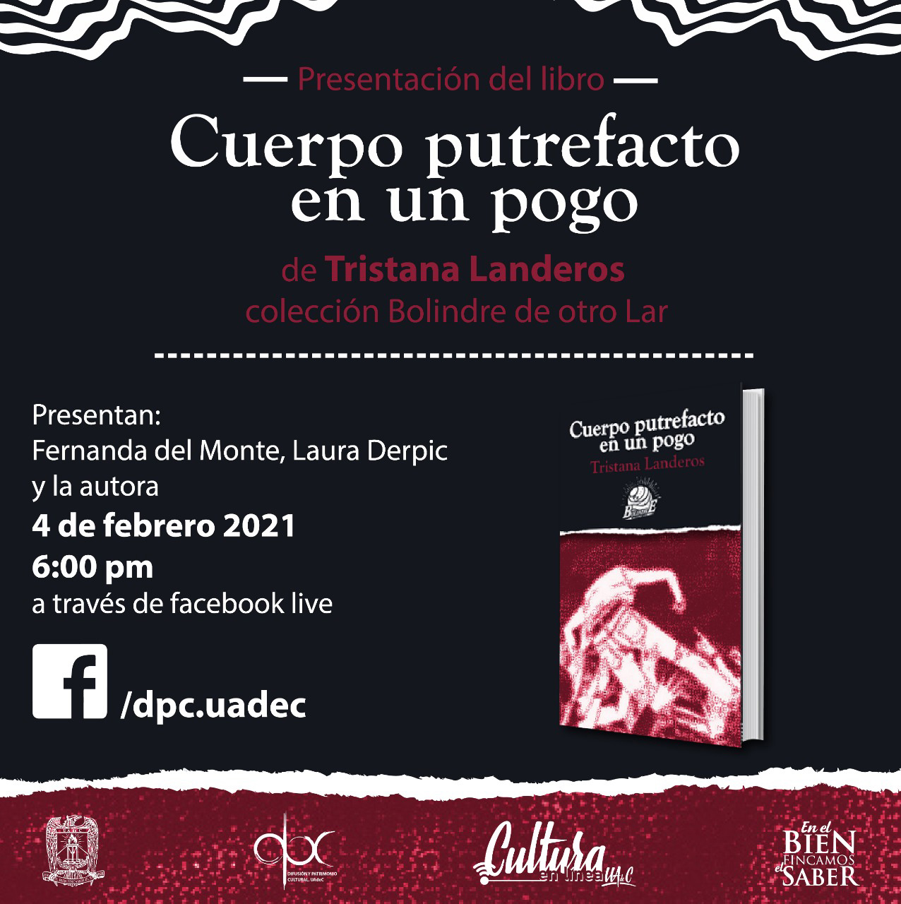El libro fue presentado por la Maestra en Dramaturgia, Fernanda del Monte y la Magister en Creación Teatral, Laura Derpic; "Cuerpo putrefacto en un pogo" es la más reciente obra de la dramaturga potosina Tristana Landeros y es publicada por la UAdeC, formando parte de la colección "Bolindre de otro Lar".