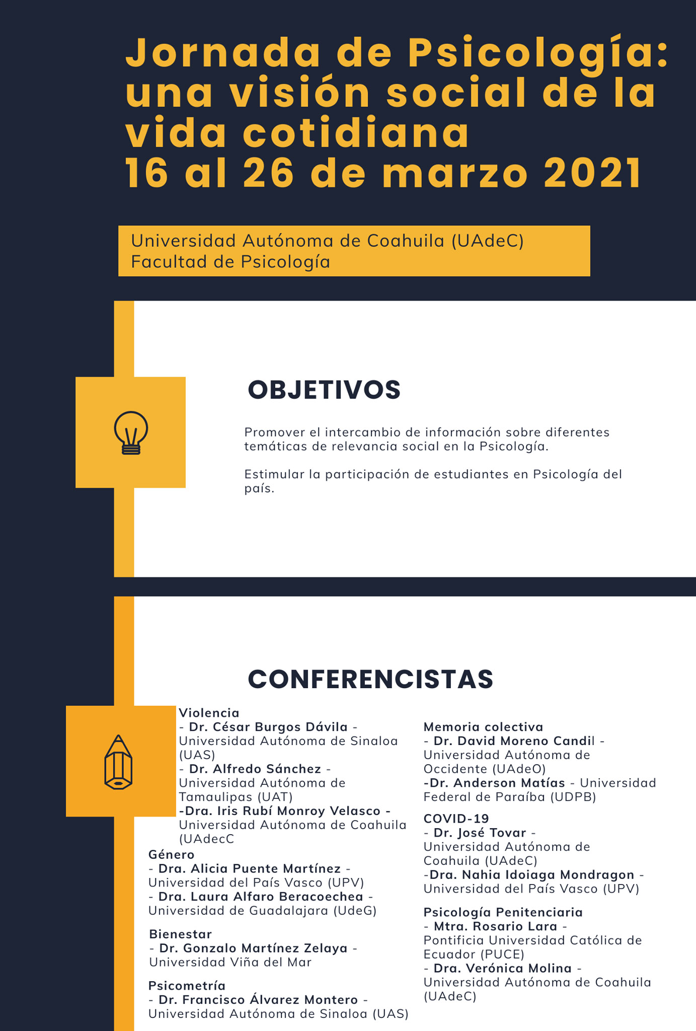 SALTILLO, Coahuila. 2 de marzo de 2021.- La Facultad de Psicología de la Universidad Autónoma de Coahuila invita a sus Primeras Jornadas de Psicología: Una visión social de la vida cotidiana, que se llevarán a cabo del 16 al 26 de marzo de 2021 de manera virtual a través de la plataforma Zoom.