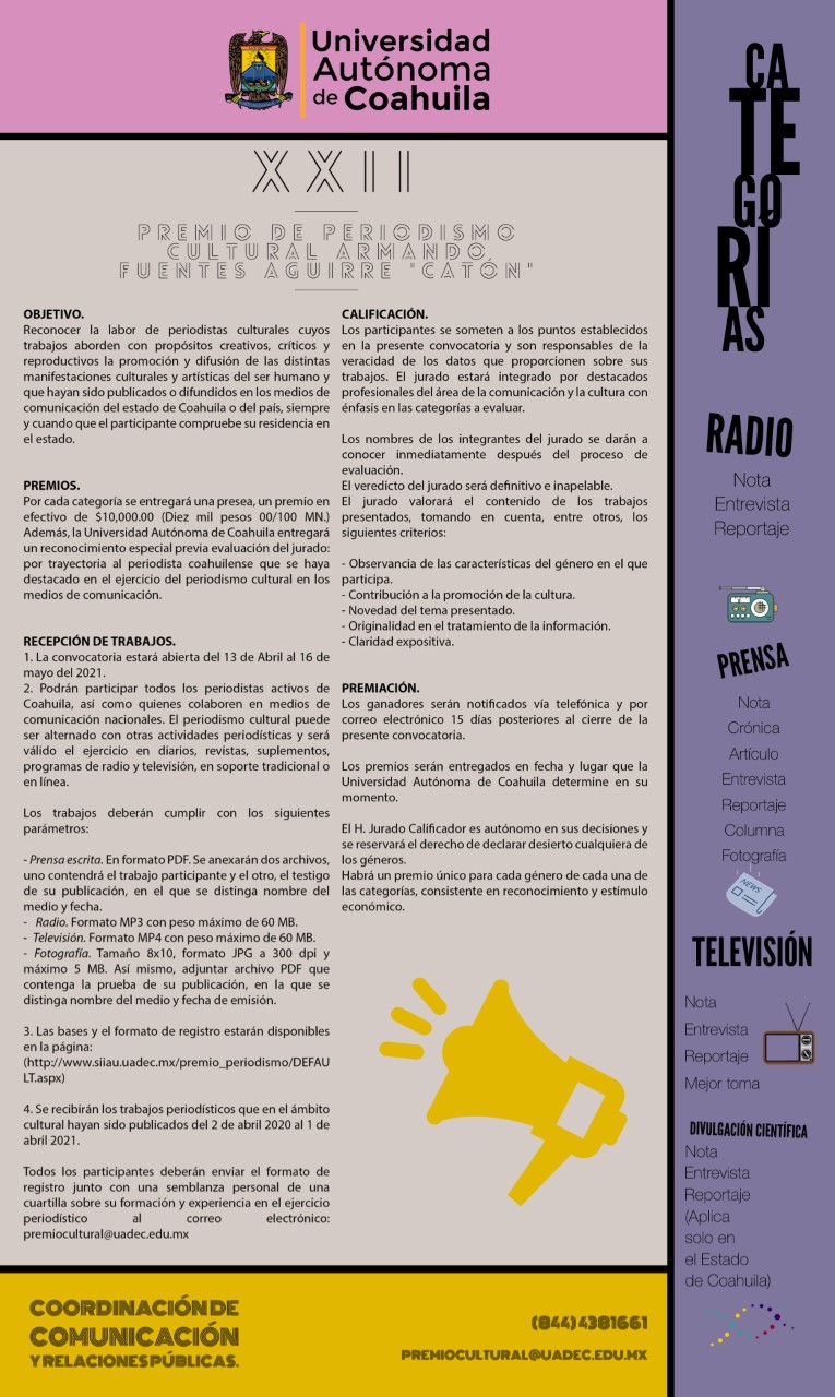 SALTILLO, Coahuila. 13 de abril de 2021. A partir del 13 de abril y hasta el 16 de mayo de 2021, la Universidad Autónoma de Coahuila abre su convocatoria para los periodistas culturales cuyos trabajos aborden, difundan o publiquen las distintas manifestaciones culturales y artísticas en medios de comunicación de Coahuila o el país.