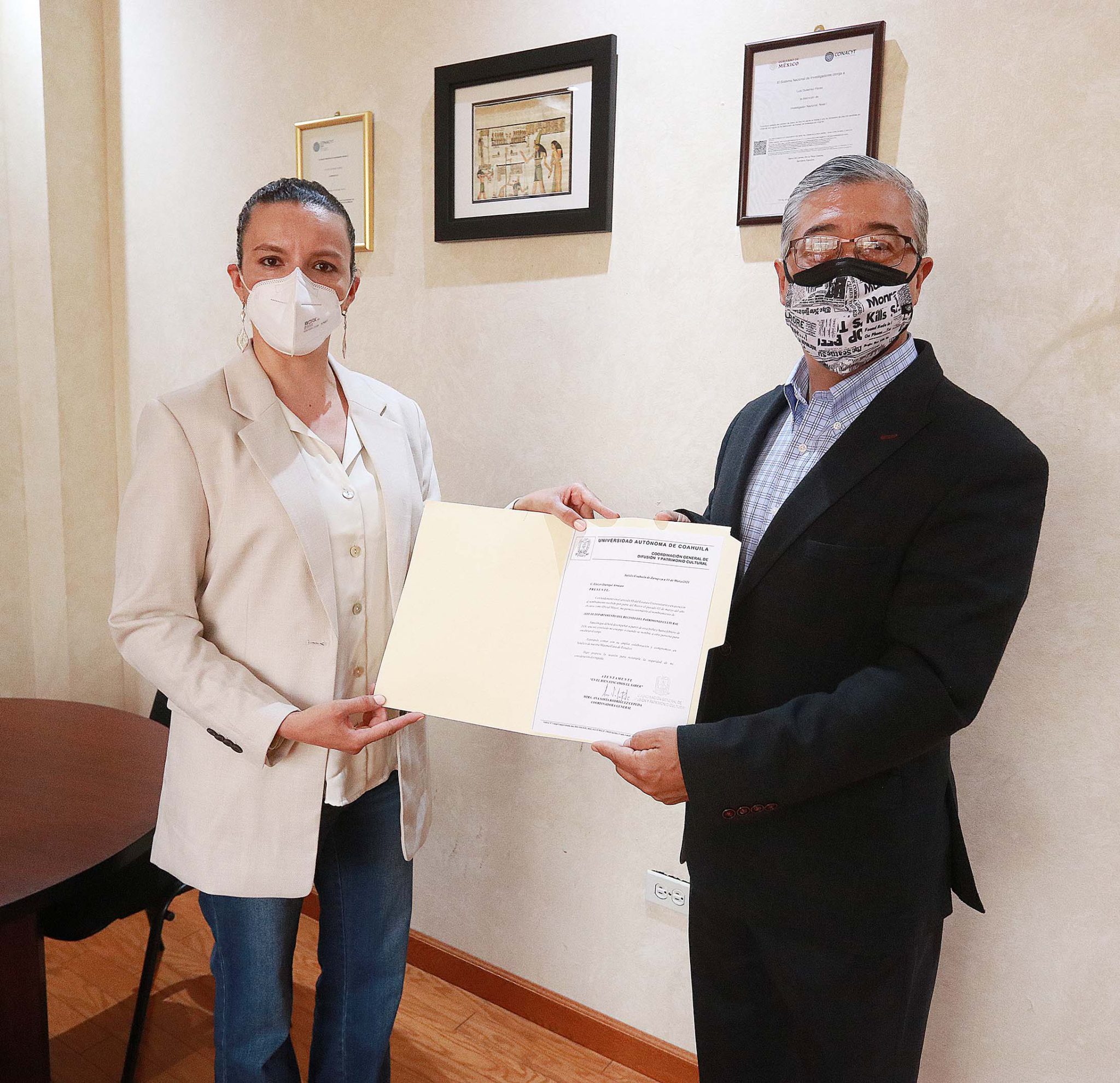 SALTILLO, Coahuila. 14 de abril de 2021.- La coordinadora general de Difusión y Patrimonio Cultural de la Universidad Autónoma de Coahuila, Ana Sofía Rodríguez Cepeda, entregó el nombramiento como Jefe de Departamento del Recinto del Patrimonio Cultural Universitario al maestro Eliézer Jáuregui Arrazáte.