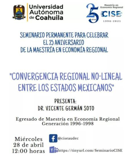 SALTILLO, Coahuila. 27 de abril de 2021.- En el marco del Seminario Permanente para celebrar el 25 aniversario de la Maestría en Economía Regional, el Centro de Investigaciones Socioeconómicas (CISE) de la Universidad Autónoma de Coahuila, convoca a la conferencia “Convergencia Regional no-lineal entre los estados mexicanos” este miércoles 28 de abril a las 12:00 horas, a través de Microsoft Teams y por el Facebook Live de @ciseuadec.