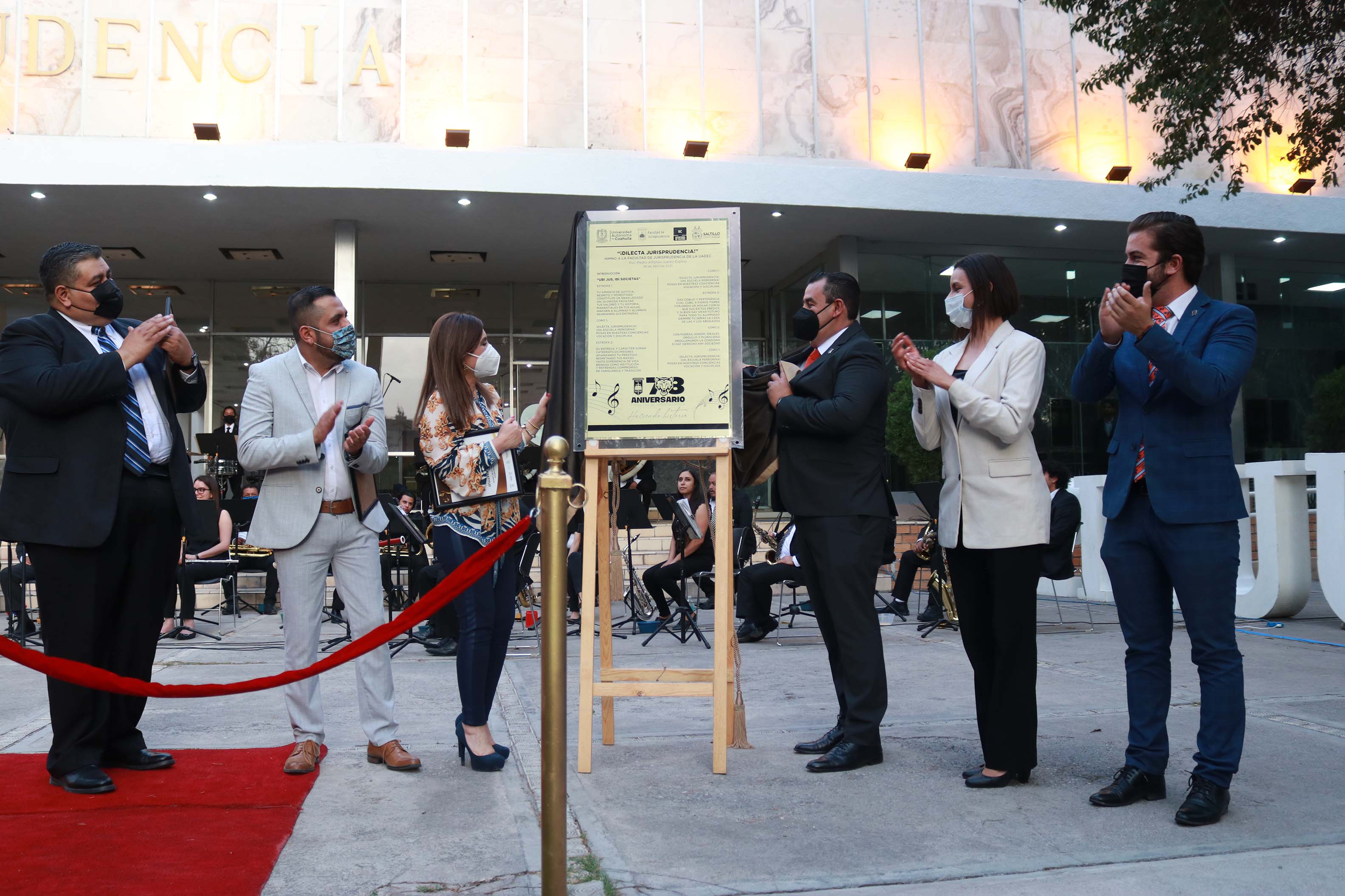 Asimismo, las autoridades develaron una placa conmemorativa de instauración del himno y se entregó reconocimiento de participación en el concurso a Manuel Ramos Reynosa y Ricardo Sena García de Torreón, así como el diploma y premio al ganador; al término del evento, la Banda de Música del Estado de Coahuila y el coro de la Benemérita Escuela Normal interpretaron la melodía “Dilecta Jurisprudencia”, escrita, compuesta y dirigida por el maestro en Música, Pedro Juárez Espino.