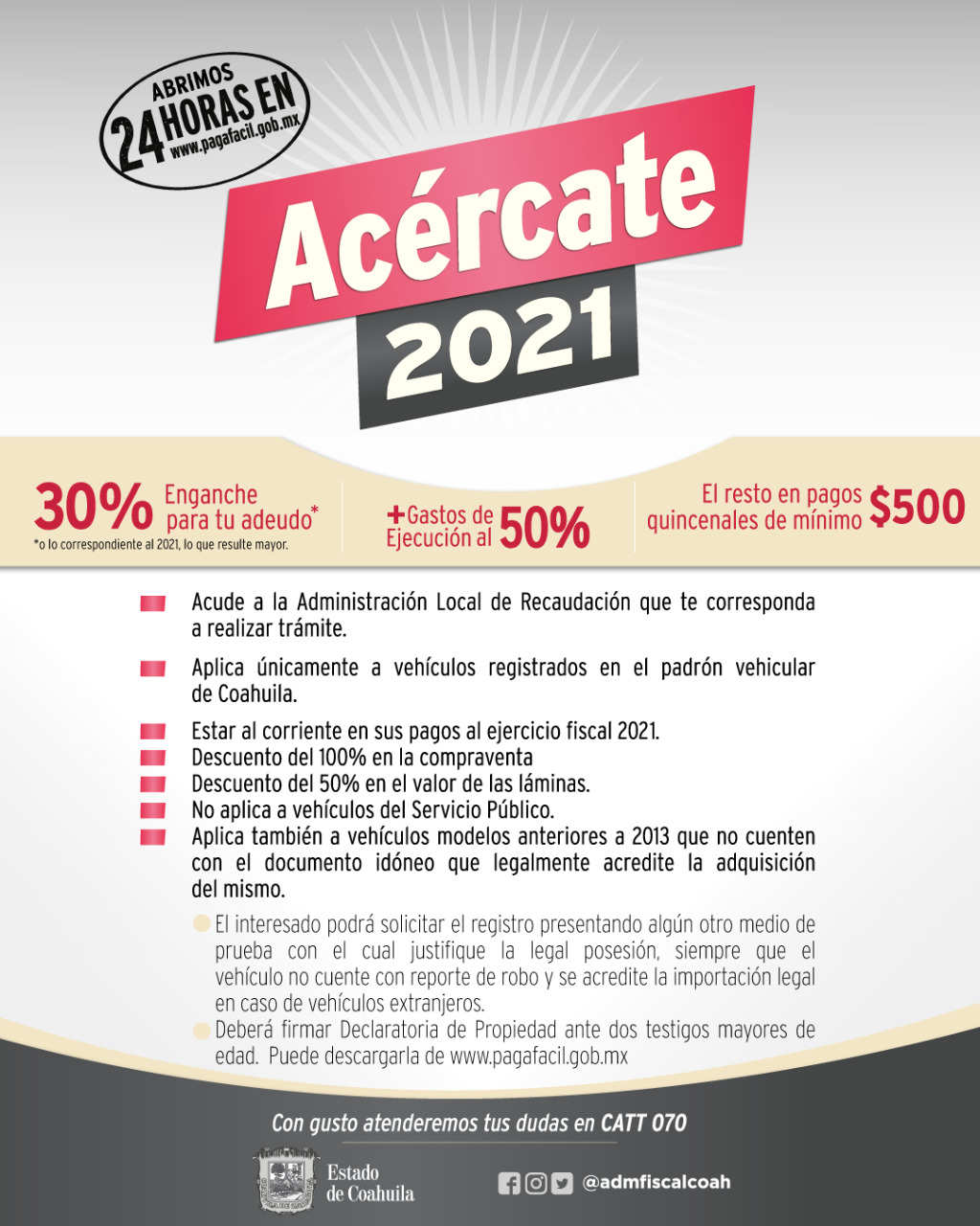Saltillo, Coahuila de Zaragoza; a 10 de Mayo de 2021.- En mayo acude a tu Administración Local de Recaudación (ARL), aprovecha el programa "Acércate" y ponte al corriente con tu adeudo de Control Vehicular en Coahuila.