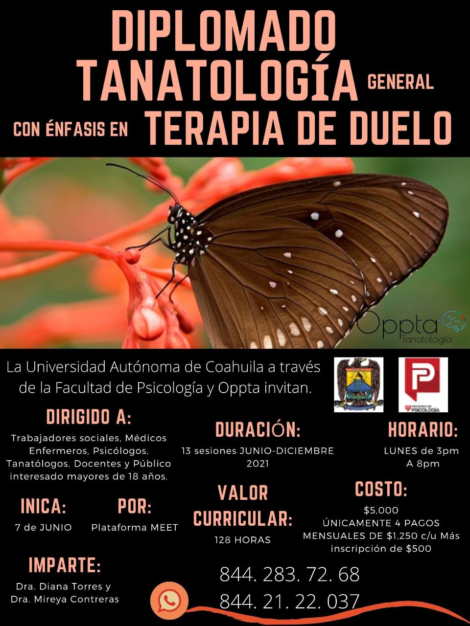 SALTILLO, Coahuila. 13 de mayo de 2021.- La Facultad de Psicología de la Universidad Autónoma de Coahuila en coordinación con el Centro de Orientación Psicológica, Pedagógica y Tanatológica (OPPTA), invitan a cursar el diplomado virtual en Tanatología General que inicia el 7 de junio.