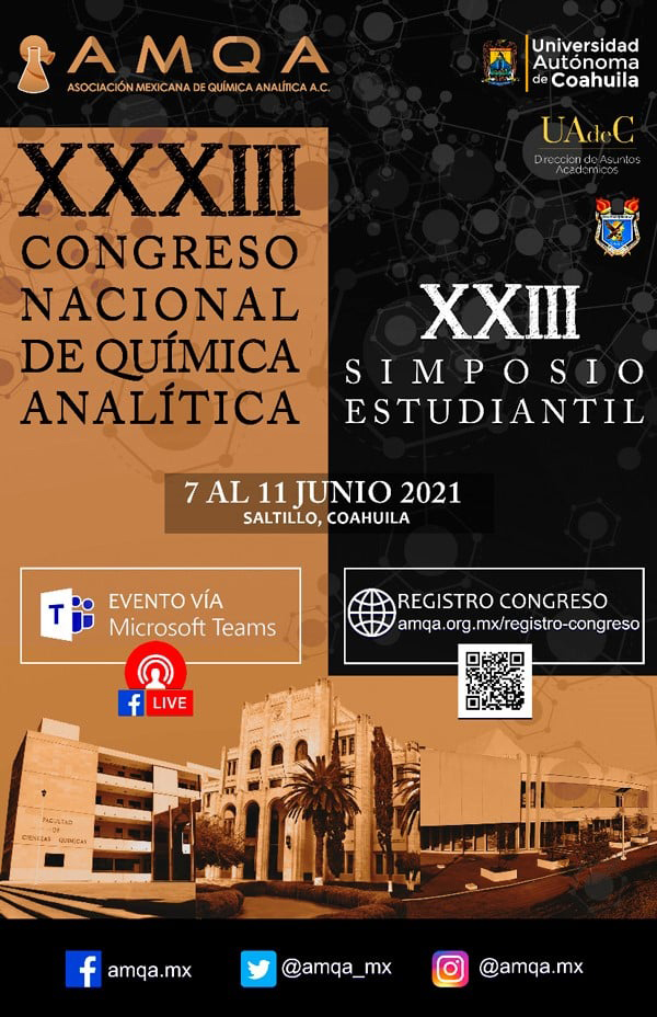 XXXIII Congreso Nacional de Química Analítica, que se llevará a cabo del 9 al 11 de junio a través de la plataforma Microsoft Teams.