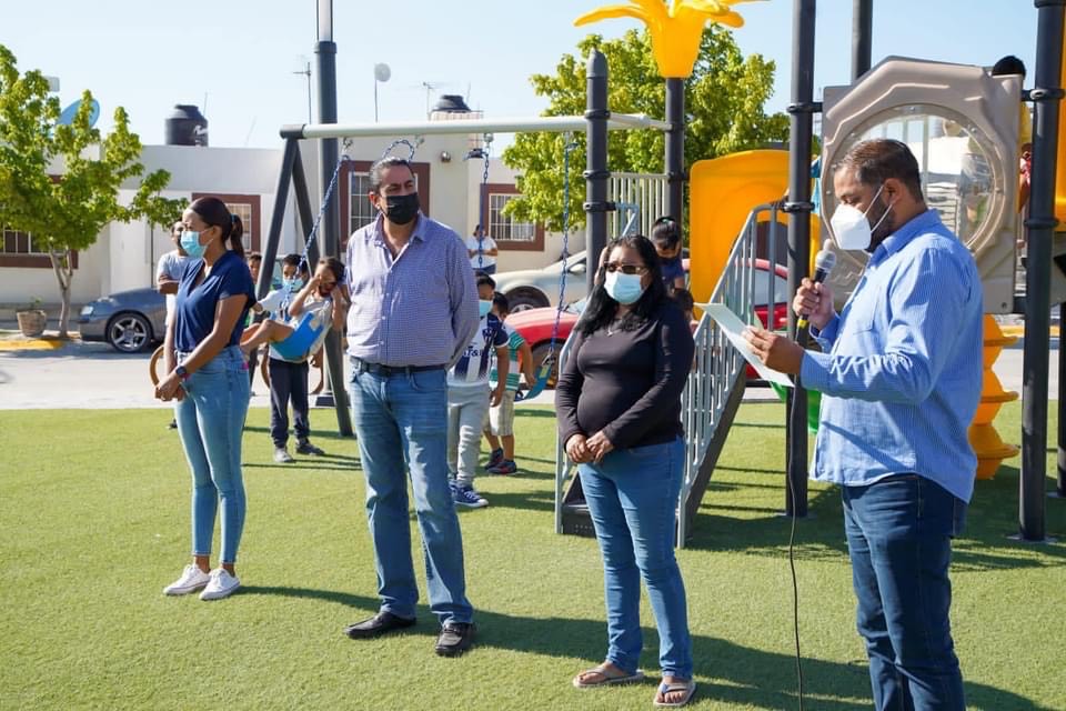 Rehabilita Chema Morales la plaza pública de la colonia La Estación con juegos nuevos, pasto sintético e iluminación LED.