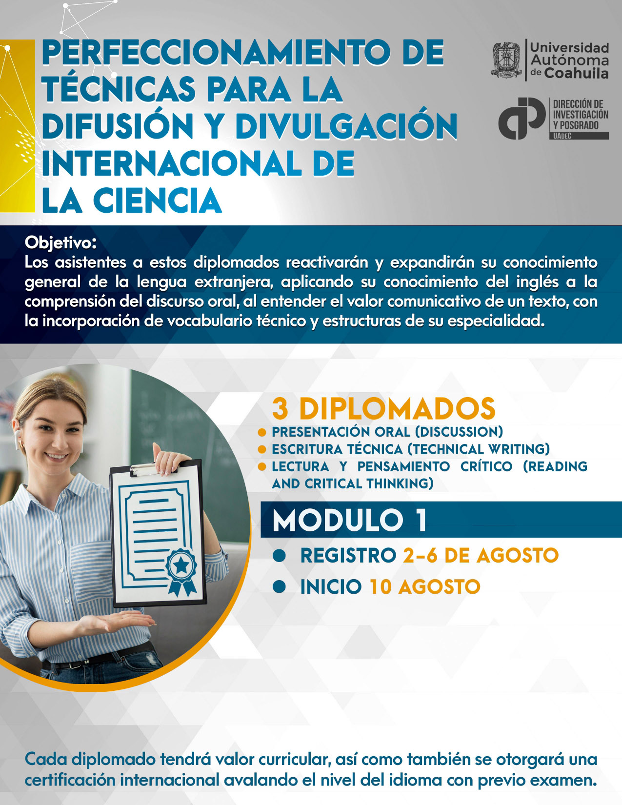 SALTILLO, Coahuila. 30 de julio de 2021.- Como parte del programa “Perfeccionamiento de técnicas para la difusión y divulgación internacional de la ciencia”, la Dirección de Investigación y Posgrado de la Universidad Autónoma de Coahuila, invita a su comunidad científica a cursar los diplomados de presentación oral, escritura técnica, y lectura y pensamiento crítico en inglés, el registro estará abierto del 2 al 6 de agosto de 2021.