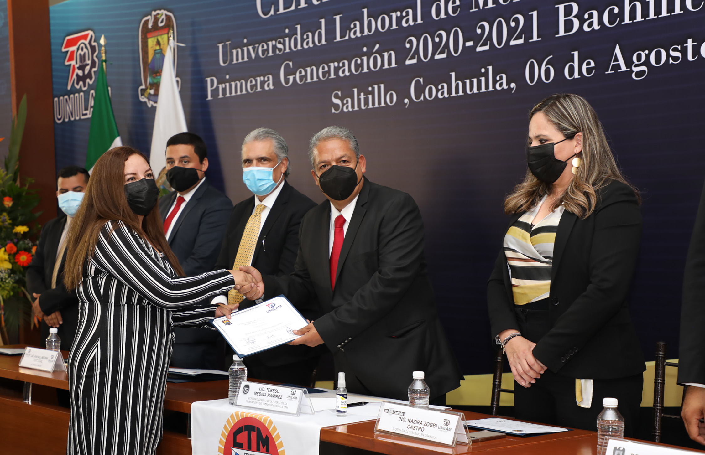SALTILLO, Coahuila. 9 de agosto de 2021.- Como parte de la alianza institucional entre la Universidad Autónoma de Coahuila y la Universidad Laboral de México 4.0 “Miguel Ramos Arizpe” (UNILAM), se llevó a cabo la ceremonia de graduación de la primera generación del Bachillerato Virtual 2020-2021, donde más de 250 trabajadores recibieron la constancia de acreditación de sus estudios en preparatoria.