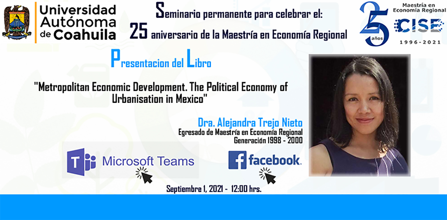SALTILLO, Coahuila. 26 de agosto de 2021.- En el marco del Seminario Permanente para celebrar el 25 aniversario de la Maestría en Economía Regional, el Centro de Investigaciones Socioeconómicas (CISE) de la Universidad Autónoma de Coahuila, convoca a la presentación del libro “Metropolitan economic development. The political economy of urbanization in Mexico”, este próximo 1 de septiembre a las 12:00 horas, a través de Microsoft Teams y por el Facebook Live: @ciseuadec.
