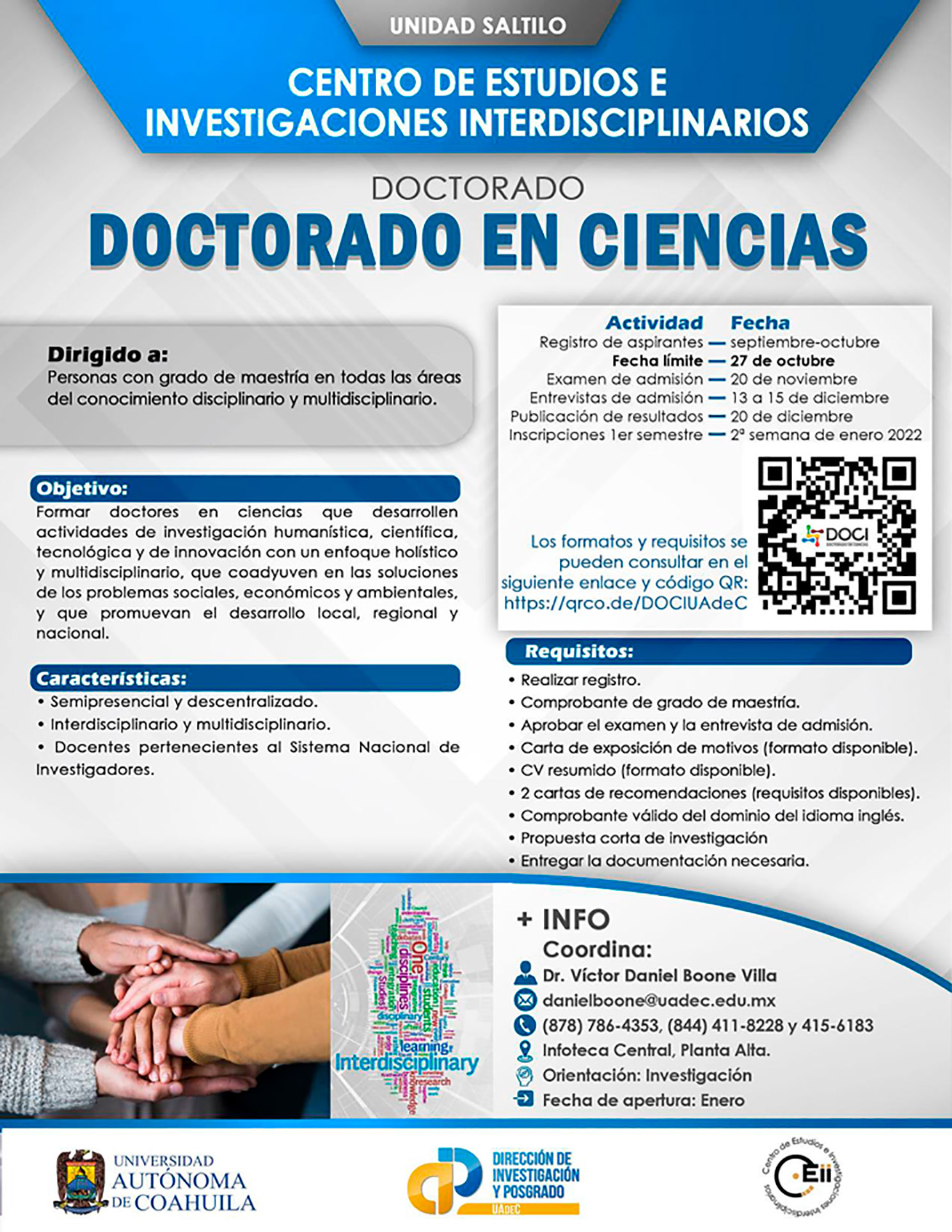 SALTILLO, Coahuila. 9 de septiembre de 2021.- El Centro de Estudios e Investigaciones Interdisciplinarios de la Universidad Autónoma de Coahuila invita a aquellos que cuenten con grado de maestría en todas las áreas del conocimiento disciplinario y multidisciplinario a postularse para ingresar al Doctorado en Ciencias.
