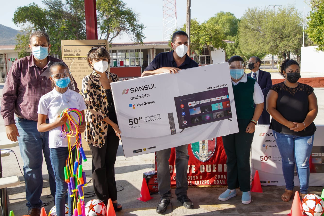 Tomas Gutiérrez, secretario de desarrollo social, informo que en esta institución se entregaron 2 pantallas de 50”, 4 mesas tipo picnic, puerta metálica para salón, un tinaco de 1000 lts., llaves para bebederos, material deportivo y productos de higiene.