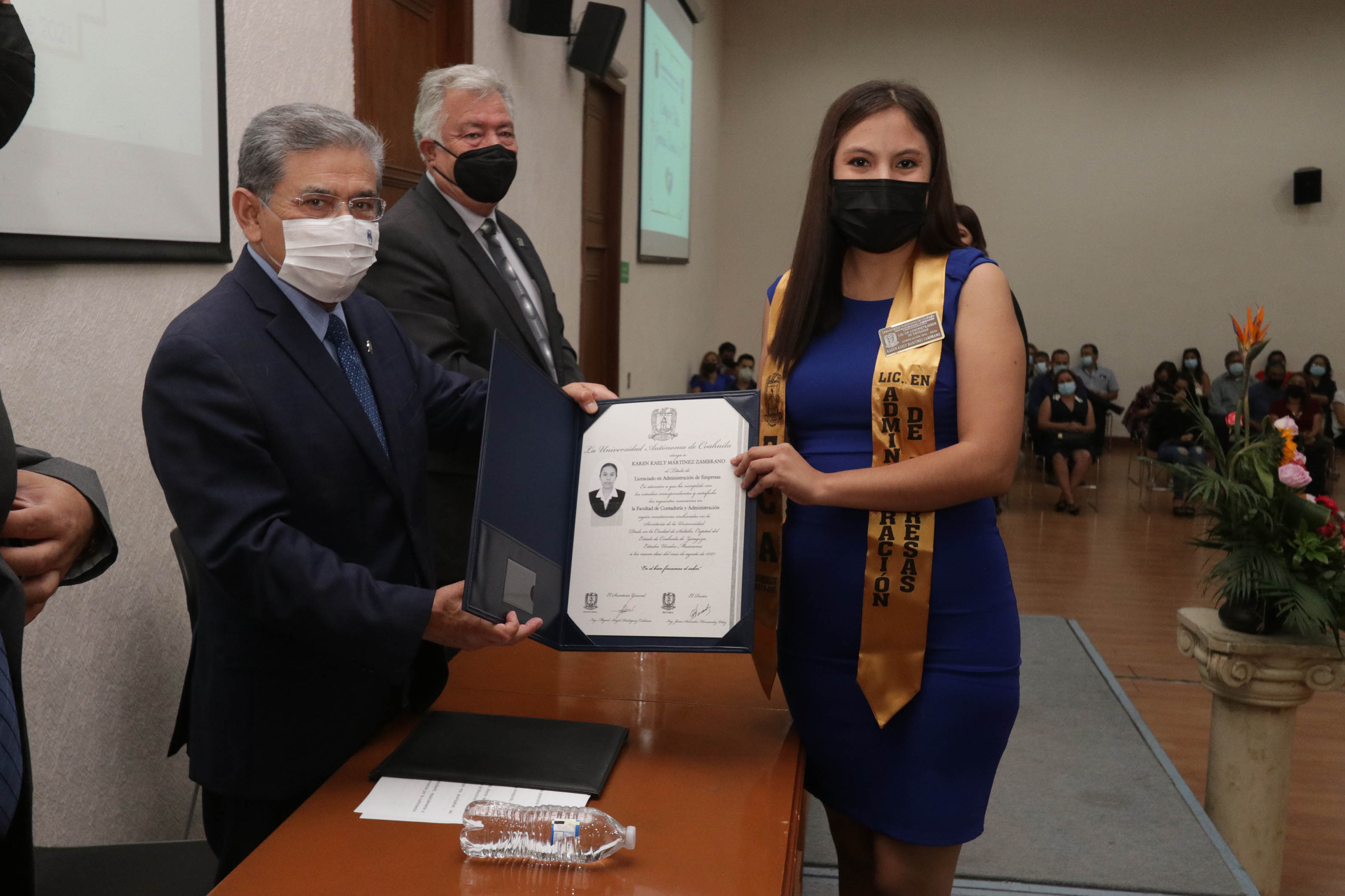 Las autoridades entregaron los títulos que acreditan la formación profesional de la generación 53 de la Licenciatura de Contaduría Pública, de la generación 53 de la Licenciatura en Administración de Empresas, de la generación 37 de la Licenciatura en Administración de Recursos Humanos y la cuarta generación de la Licenciatura en Negocios Internacionales; de igual forma, se entregaron los diplomas a los mejores promedios de cada carrera.