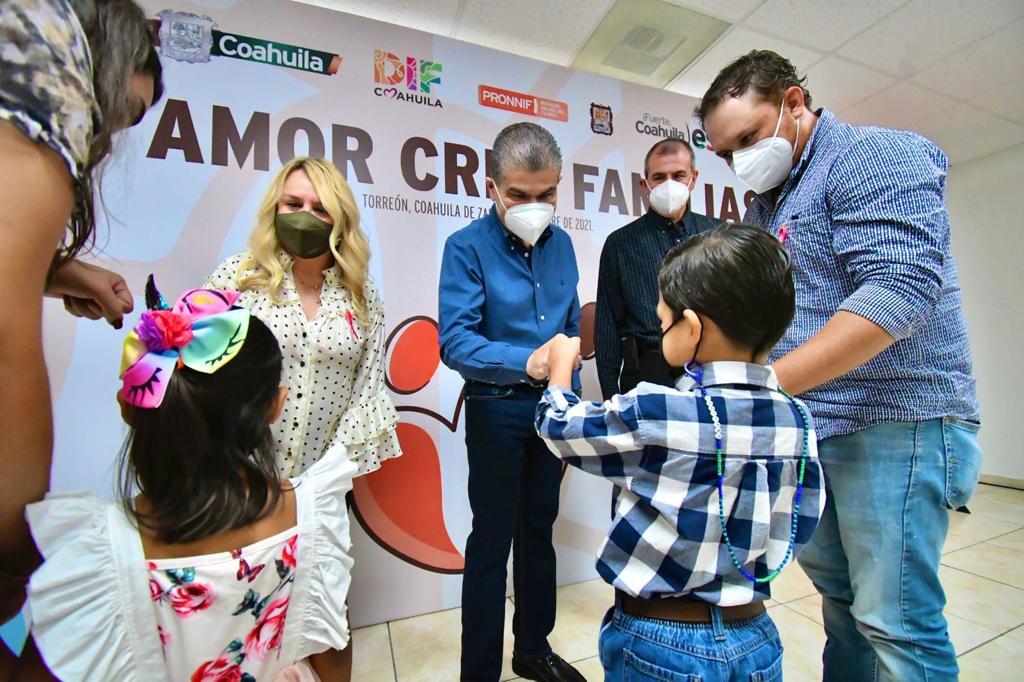Torreón, Coahuila de Zaragoza; a 18 de Octubre de 2021.- La restitución de los derechos de las niñas, niños y adolescentes es uno de los ejes más importantes del Gobierno de Coahuila, es por eso que con el fin de garantizar su derecho vivir en familia, el gobernador Miguel Ángel Riquelme Solís, acompañado de su esposa, Marcela Gorgón, Presidenta Honoraria del DIF Coahuila, encabezó el evento en el que niñas, niños y adolescentes se unieron a las que a partir de este lunes son sus nuevas familias.