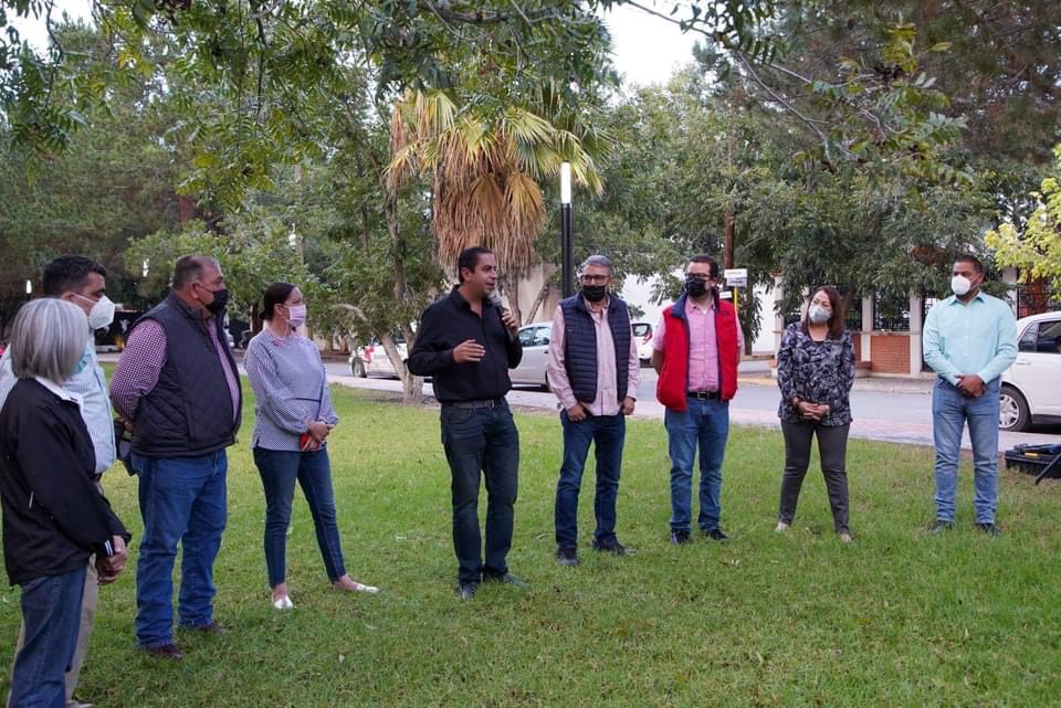 Rehabilita Chema Morales dos plazas en el Fraccionamiento La Nogalera con luminarias, instalación eléctrica, botes de basura y bancas metálicas.