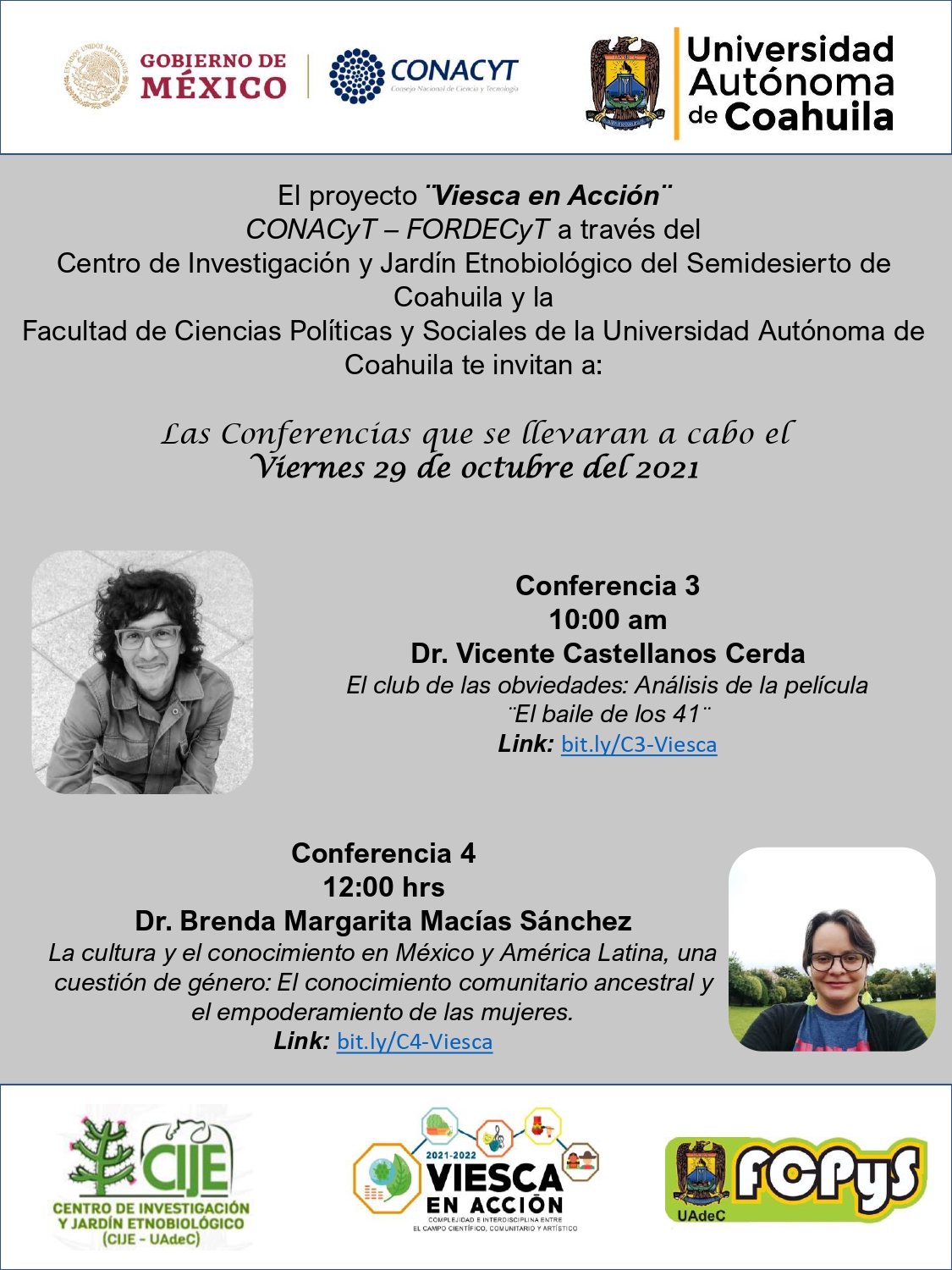 Mientras que, el 8 de noviembre a las 10:00 horas a través de Microsoft Teams se impartirá “Bioindicadores de la región, impacto de las actividades antropogénicas en la calidad de biodiversidad de la región de Viesca” por el Dr. David Ramiro Aguillón Gutiérrez acceso en el enlace bit.ly/C9-Viesca y a las 12:00 horas “El café y los procesos científicos y artesanales de su preparación para distribución y venta: Emprendimiento para un comercio sustentable desde la cafetería del pueblo” a cargo del Ing. Químico Héctor Caballero Serna, acceso en bit.ly/C10-Viesca.
