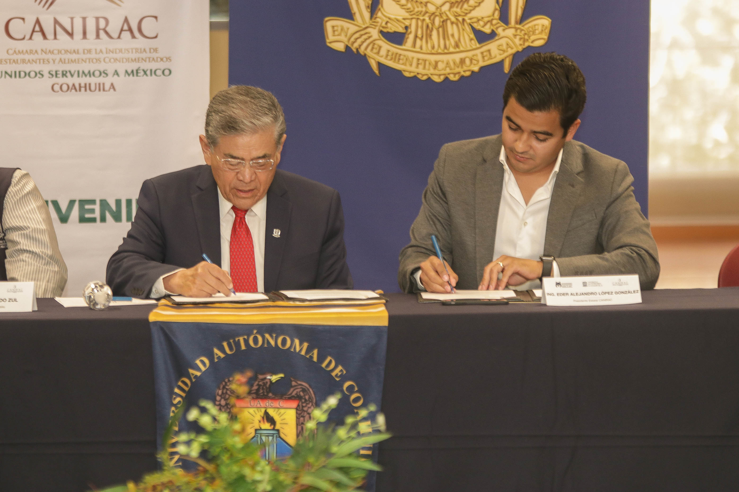 La ceremonia se llevó a cabo en la Sala de Seminarios “Emilio J. Talamás”, de la Unidad Camporredondo, en donde signaron el documento el rector de la máxima casa de estudios, Salvador Hernández Vélez y el presidente estatal de CANIRAC, Eder Alejandro López González, acompañados por el coordinador General de Vinculación e Innovación Productiva de la UAdeC, Octavio Pimentel Martínez y el vicepresidente de CANIRAC Saltillo, Carlos Daniel Guajardo Elizondo.