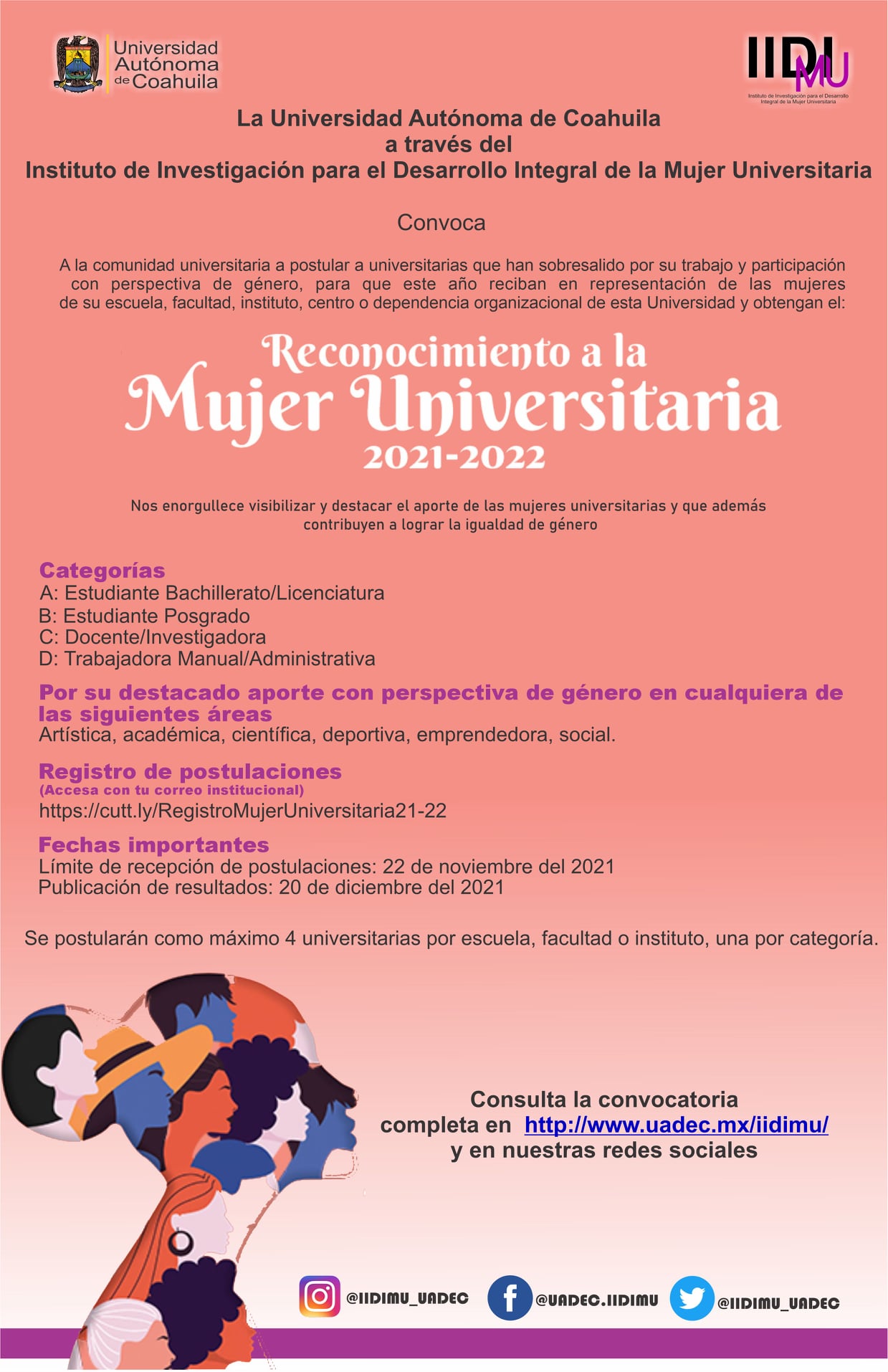 SALTILLO, Coahuila. 11 de noviembre de 2021.- La Universidad Autónoma de Coahuila a través del Instituto de Investigación para el Desarrollo Integral de la Mujer Universitaria IIDIMU, convoca a la comunidad universitaria a presentar propuestas de mujeres que han sobresalido en su trabajo, participación y promoción de perspectiva de género, para que reciban en representación de las mujeres de su escuela, facultad, instituto, centro o dependencia organizacional el “Reconocimiento a la Mujer Universitaria 2021-2022”.