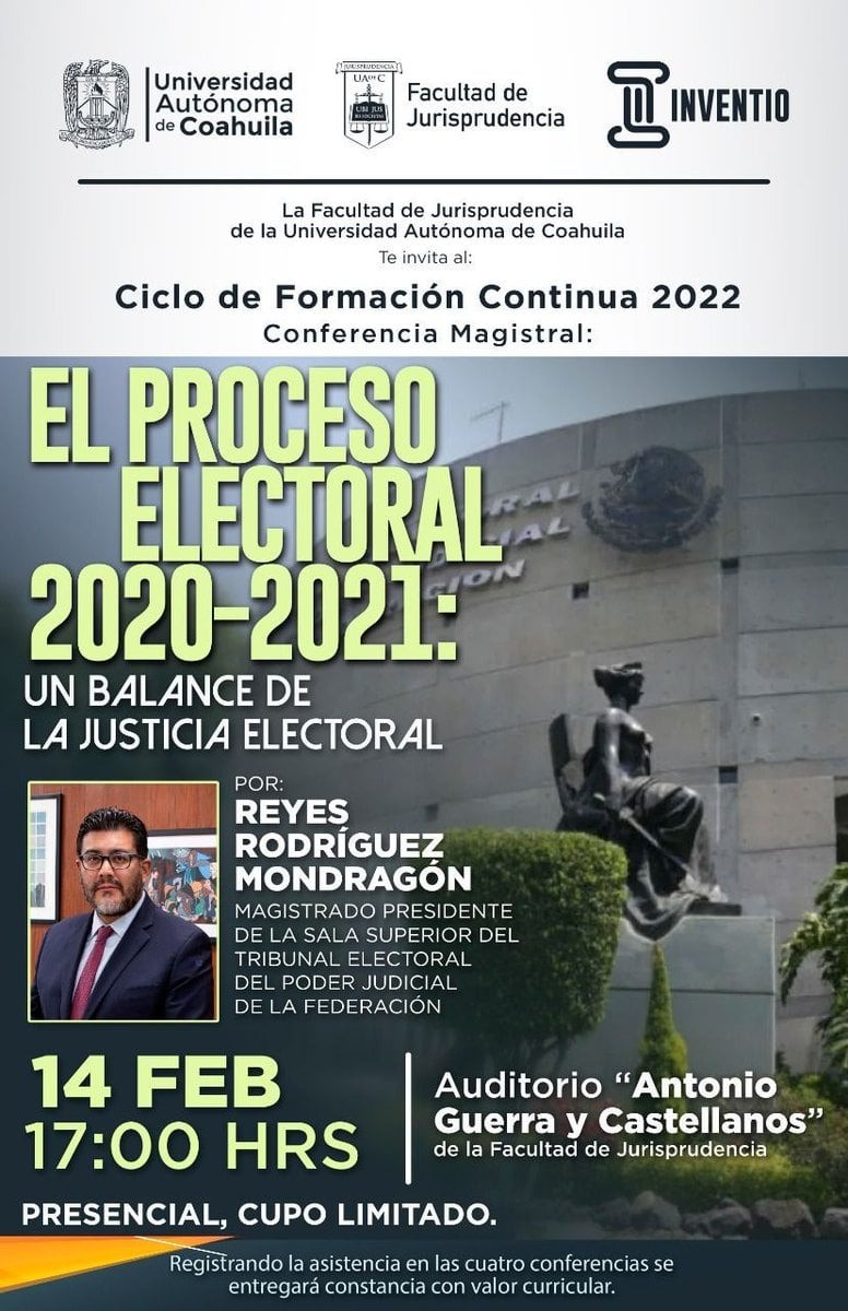 SALTILLO, Coahuila. 4 de febrero de 2022.- Como parte del Ciclo de Formación Continua 2022, la Facultad de Jurisprudencia de la Universidad Autónoma de Coahuila, invita a la comunidad universitaria y sociedad en general a la conferencia magistral “El proceso electoral 2020-2021: Un balance de la justicia electoral”, que se llevará a cabo el 14 de febrero a las 17:00 horas en el auditorio “Antonio Guerra y Castellanos” del plantel.